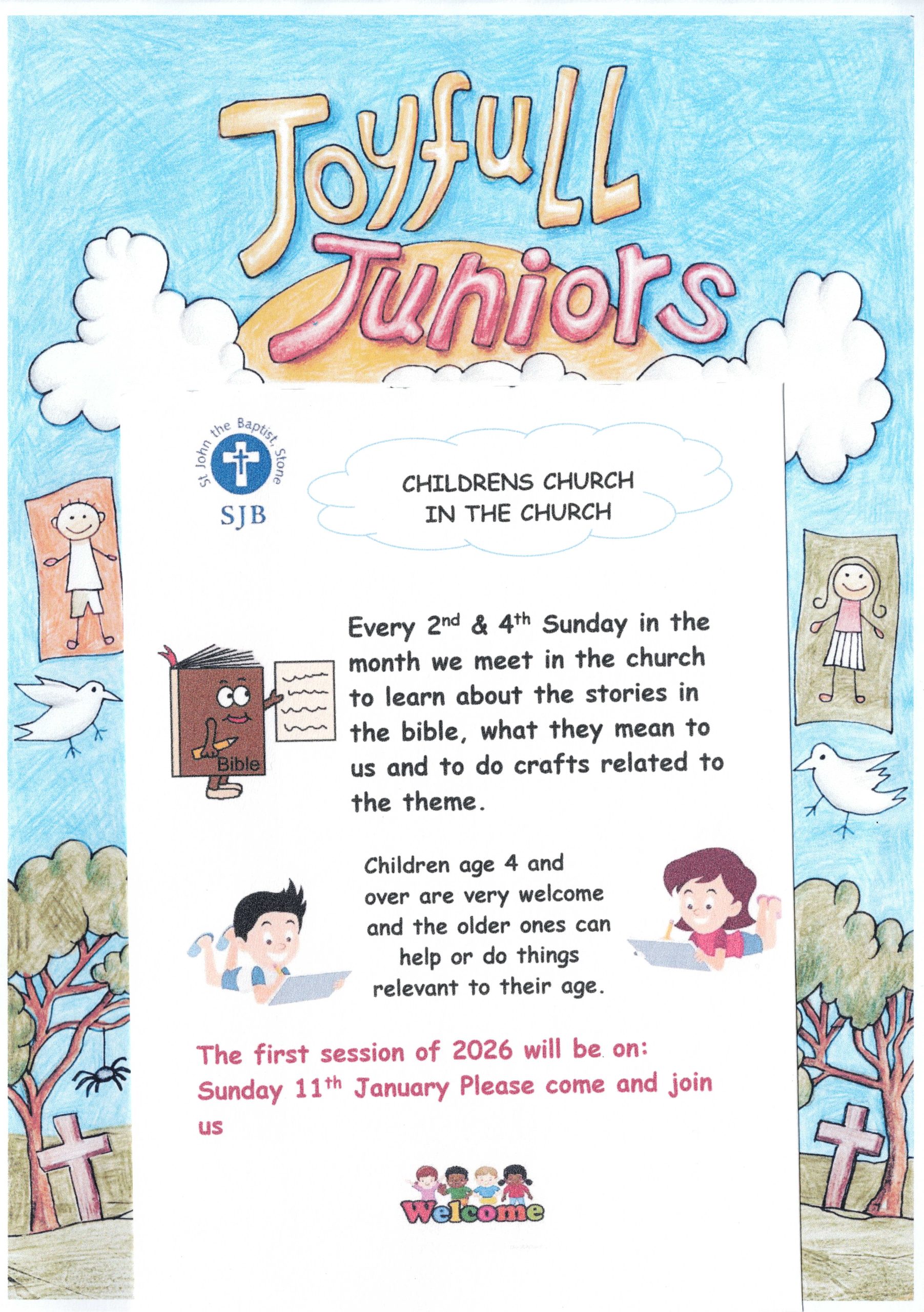 Our Childrens Church, Joyfull Juniors, meet on the 2nd and 4th Sunday of the month at St John the Baptist, Stone. We would love to see you there.